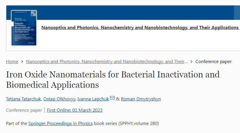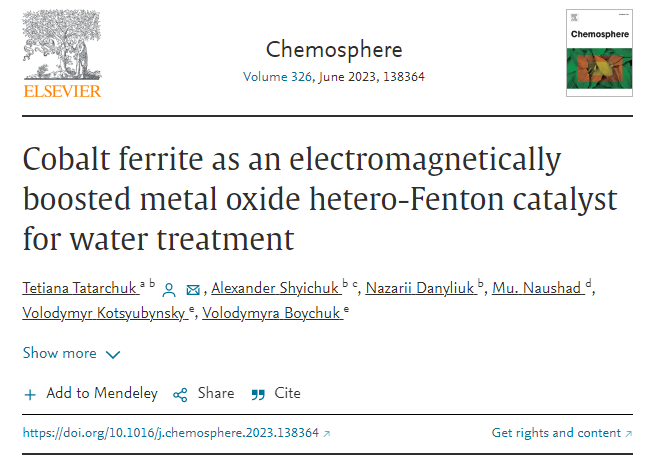 В березні 2023 р. журнал Chemosphere (SCOPUS; IF = 8.943; Q1) прийняв до друку чергову наукову статтю директорки Центру, доцентки кафедри хімії Тетяни ТАТАРЧУК на тему: “Cobalt ferrite as an electromagnetically boosted metal oxide hetero-Fenton catalyst for water treatment”. Співавторами статті Читати далі
